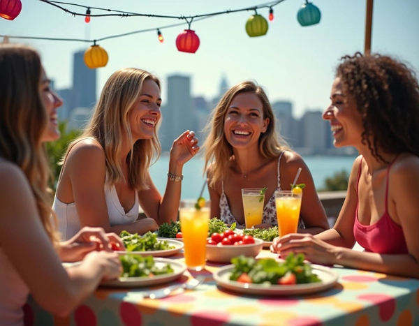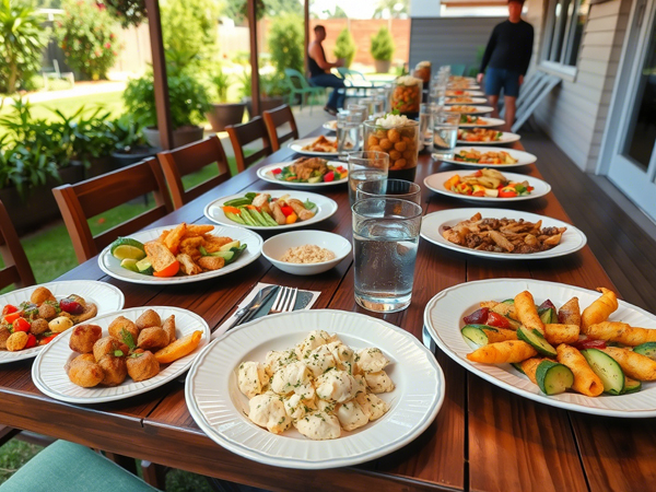 Меню для проведения летнего дня рождения должно быть максимально легким. Не стоит предлагать гостям тяжелые салаты с майонезом или слишком жирные блюда. Пусть угощения будут сочными, низкокалорийными. Рыба, курица, фруктовые и овощные тарелки, сыры, морепродукты и т.д.